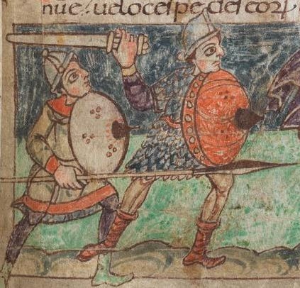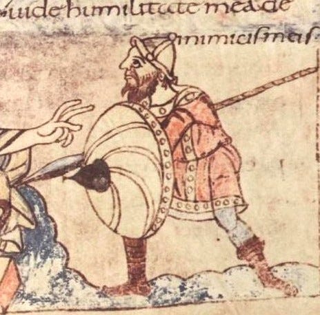 The men above are mounted; you can see the little horse-heads peeking between the shields. Frankish infantry formations are barely present in the pictorial record, though we have some literary descriptions, and other evidence of individual Frankish infantrymen, like below.